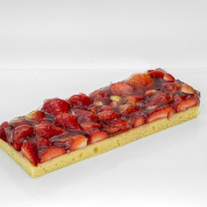 Sommergenuss pur! Feinster Biskuit mit frischen Erdbeeren belegt, mit Gelee verziert.